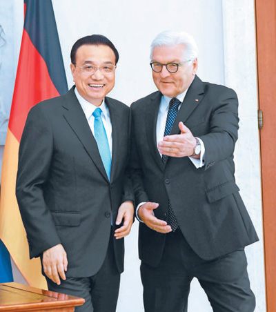 李克强首先转达习近平主席对施泰因迈尔总统的诚挚问候。李克强表示,当前中德关系继续保持高水平快速发展势头。本轮中德政府磋商制定了两国下阶段各领域合作的路线图。双方一致同意加强全方位战略合作,以实际行动共同发出坚定维护多边主义和自由贸易的信号。在21世纪的今天,设置贸易壁垒是过时的行为。中方愿同德方继续保持高层交往,加强各领域交流与合作,做求同存异、寻求共同利益最大化合作的典范。