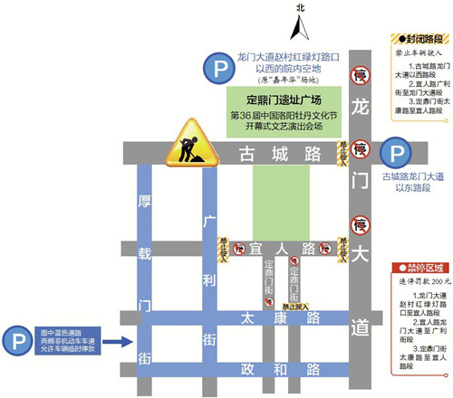 开车去看牡丹文化节开幕式,哪里能停车?昨日,市交警支队发布牡丹文化节开幕式交通提示,公布了开幕式现场周边的封闭路段、禁停区域、停车区域。这张交通提示地图,希望能给您提供便利。