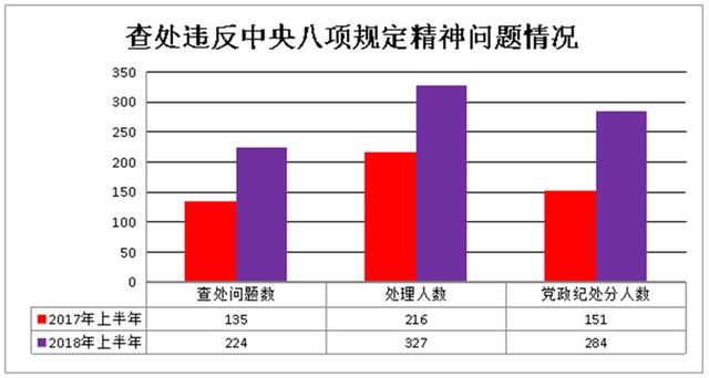 7月19日,市纪委对2018年上半年全市查处违反中央八项规定精神问题情况进行了通报。上半年,全市共查处违反中央八项规定精神问题224起,处理327人,党政纪处分284人,查处问题数、处理人数、党政纪处分人数排名均在全省前列,与去年同期相比分别增长66%、51%和88%。