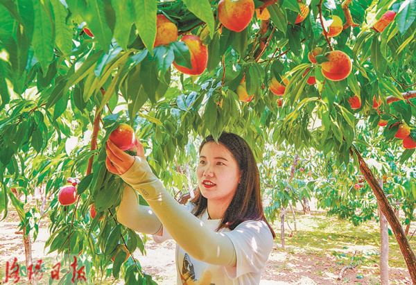 近日,在孟津县送庄镇白鹿村的桃园里,鲜桃挂满枝头,吸引游客采摘。近年,该镇持续培育做大鲜桃产业,全镇种植鲜桃树3000余亩,年产鲜桃450万公斤,成为群众脱贫致富的“摇钱树”。(洛阳日报记者 鲁博 通讯员 郑战波 谢广秋 摄)
