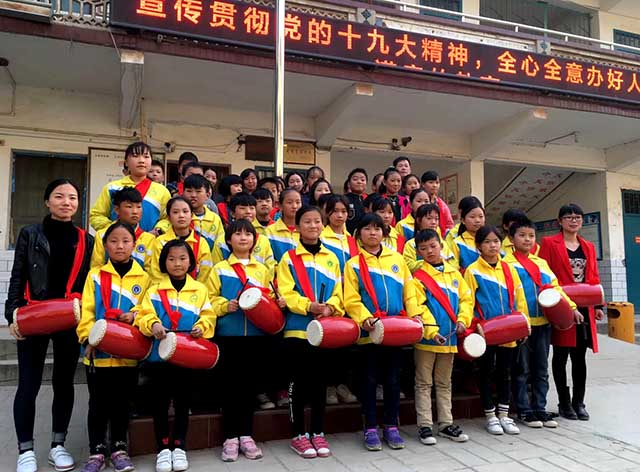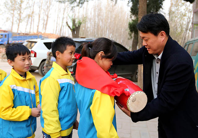 图文:第十八个中国记者节,省市新闻媒体工作人员到宜阳县高村乡中心学校宣讲十九大精神,并为学校捐建腰鼓。(刘谨谨)
